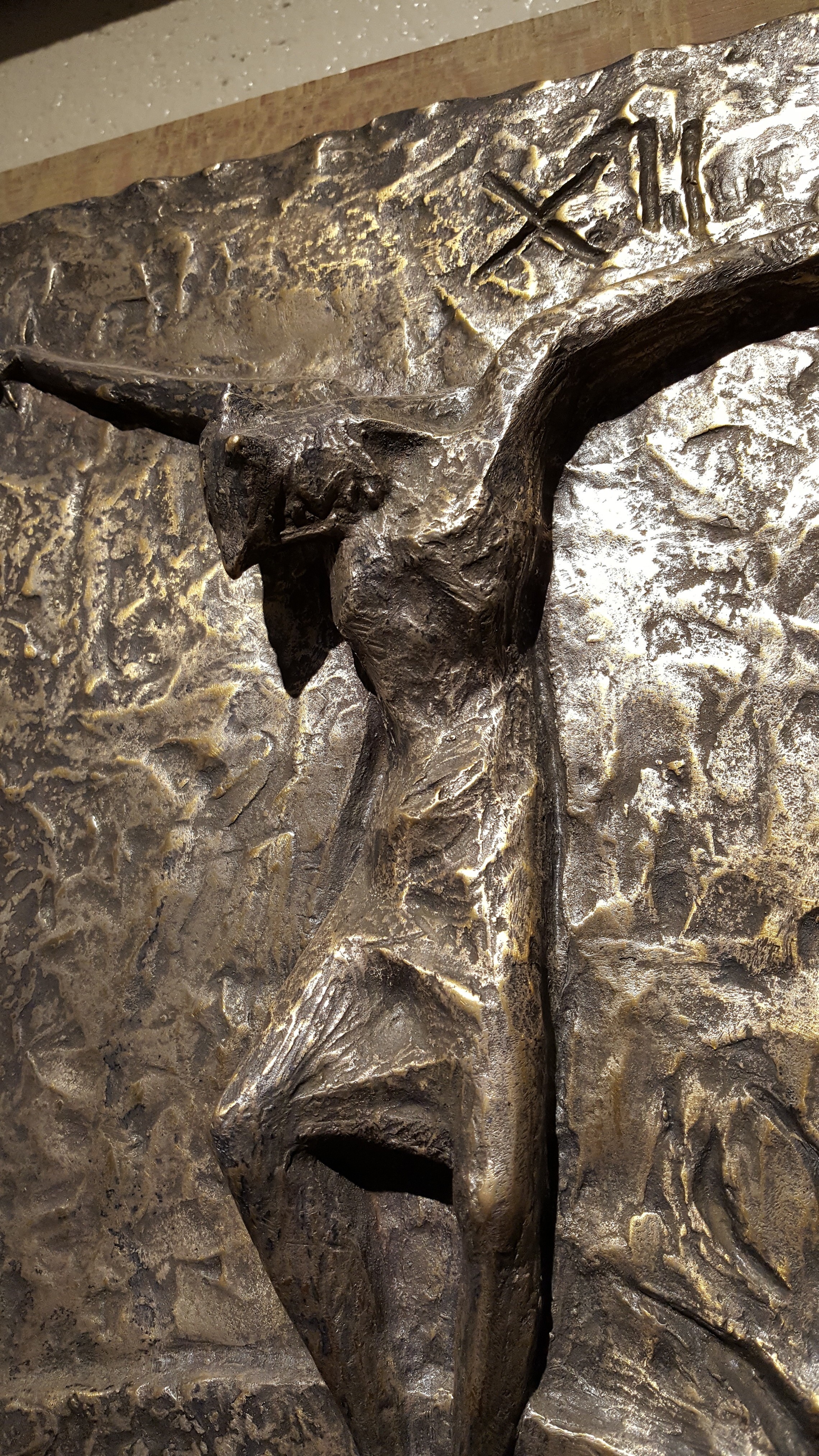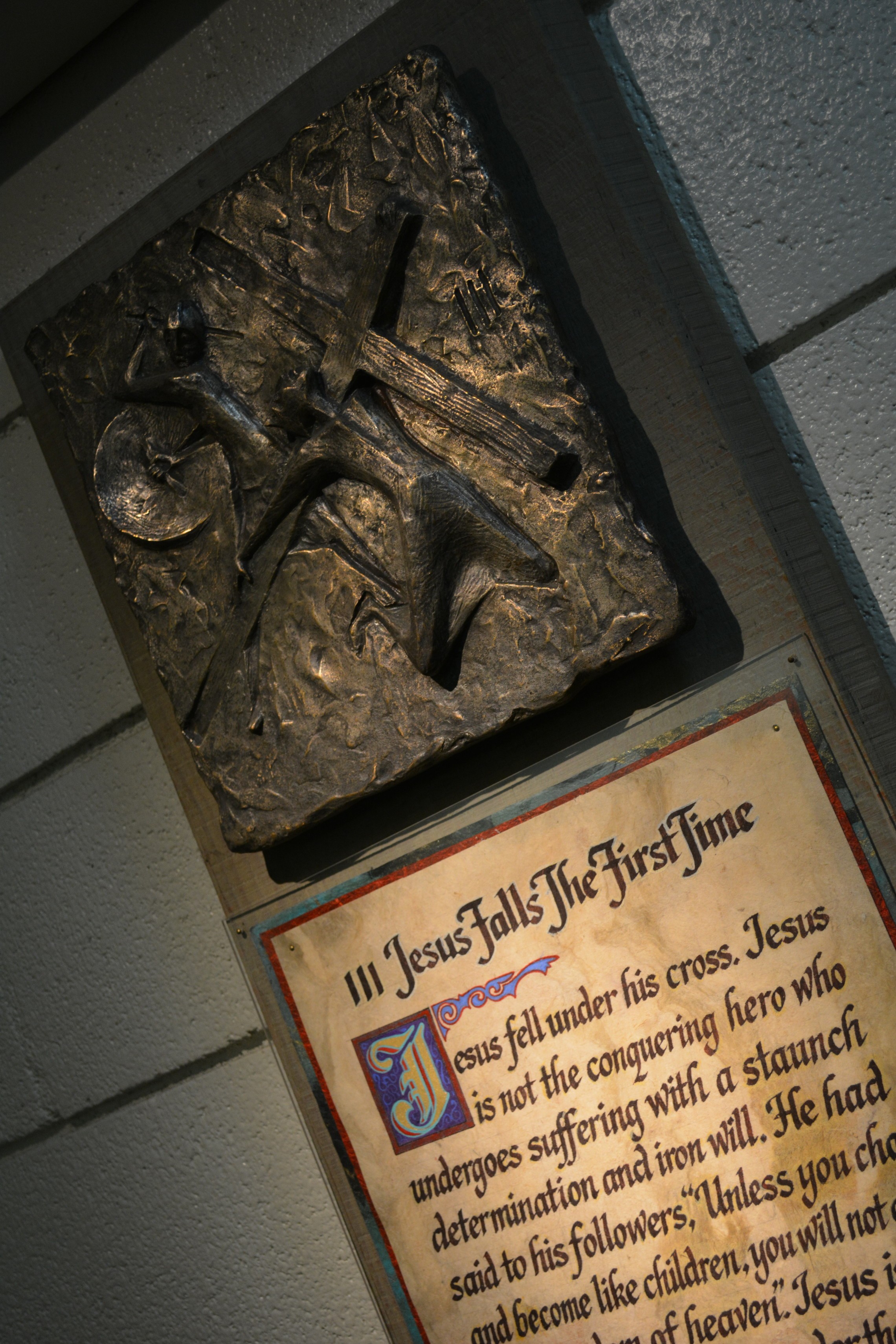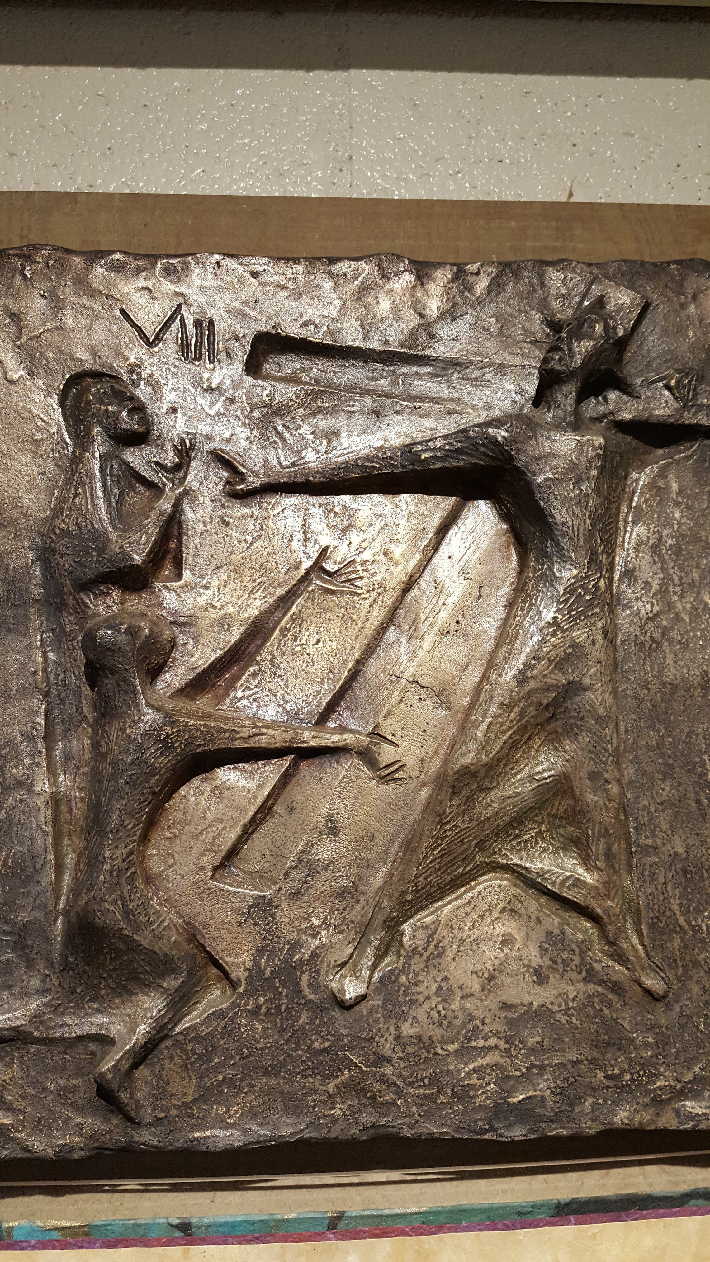 The copper figures were mounted on rough-sawn wood by Barbara and, years later, text was added beneath them. The content of the text was borrowed from Henri Nouwen’s “Stations of the Cross.” Dale Oftedal, a local artist, calligraphed the manuscript beneath each station on parchment.