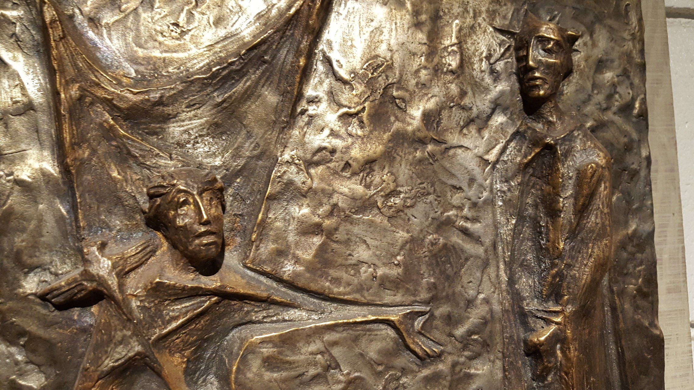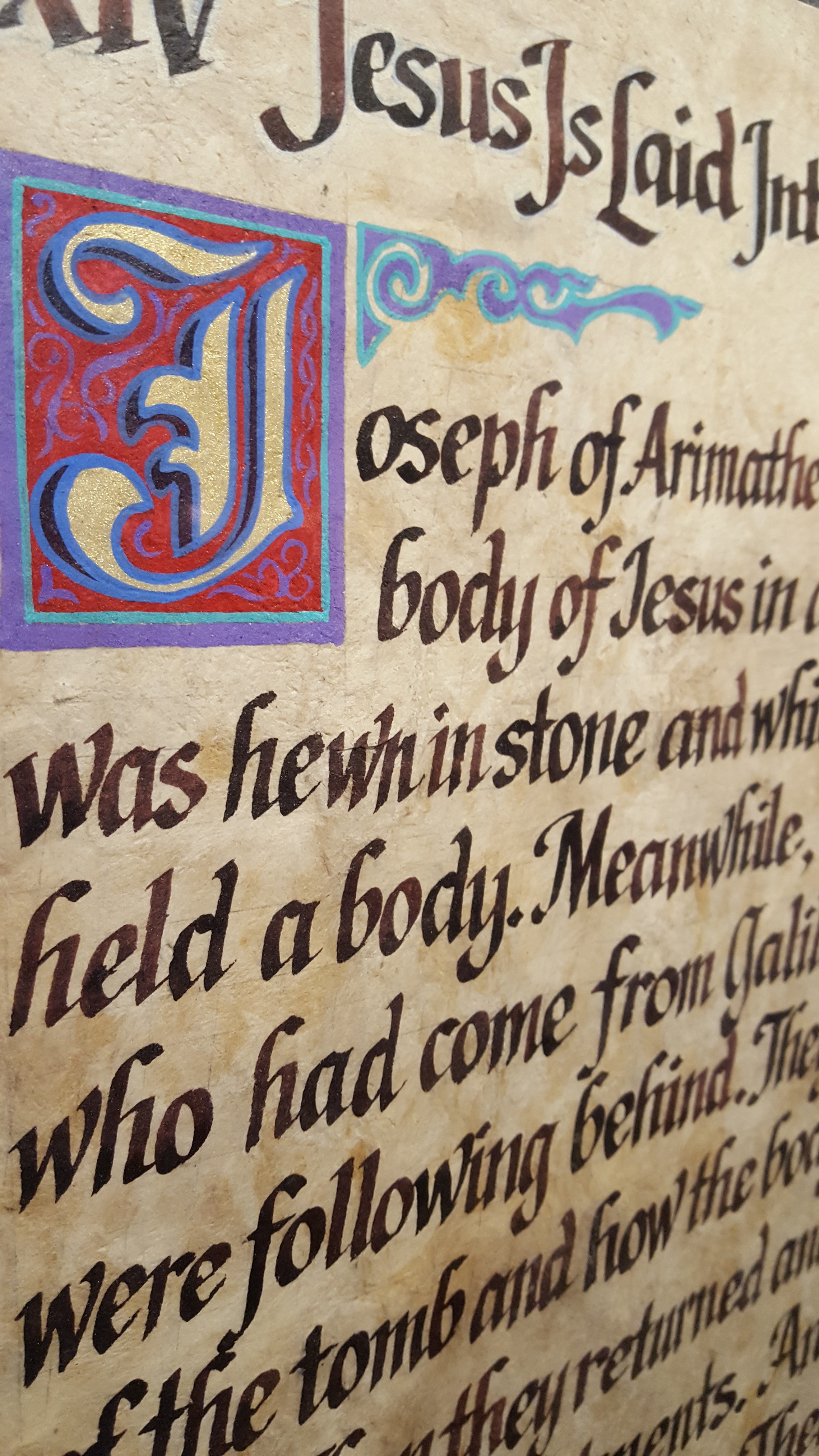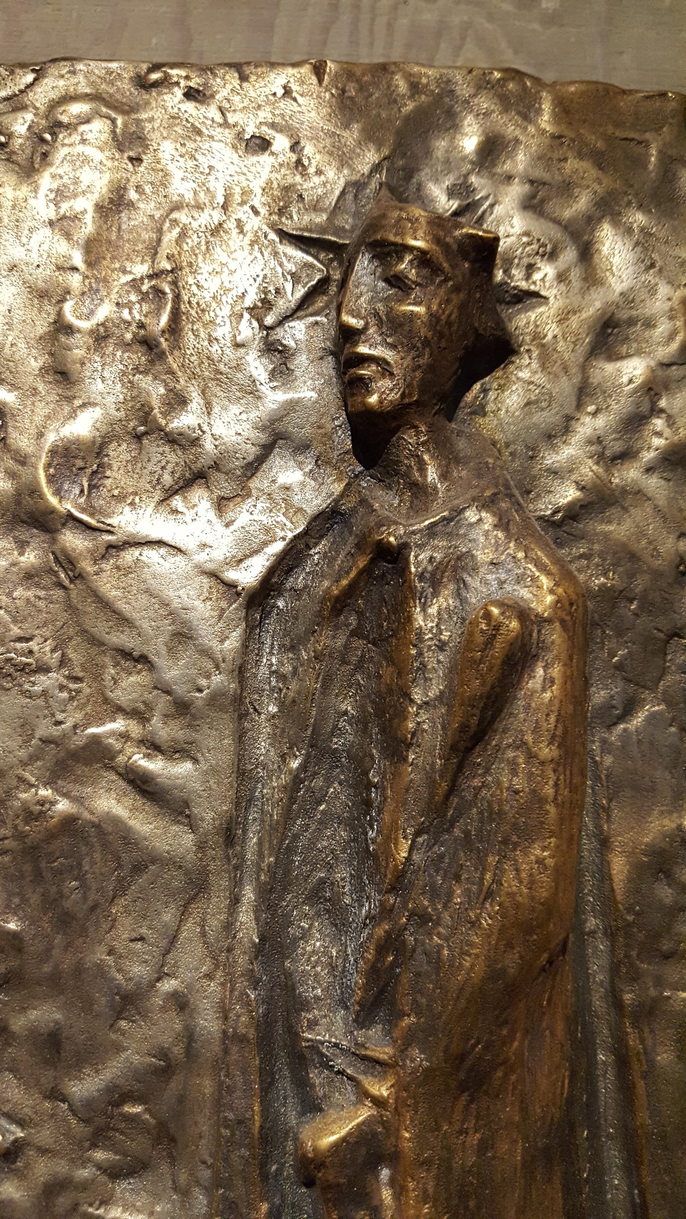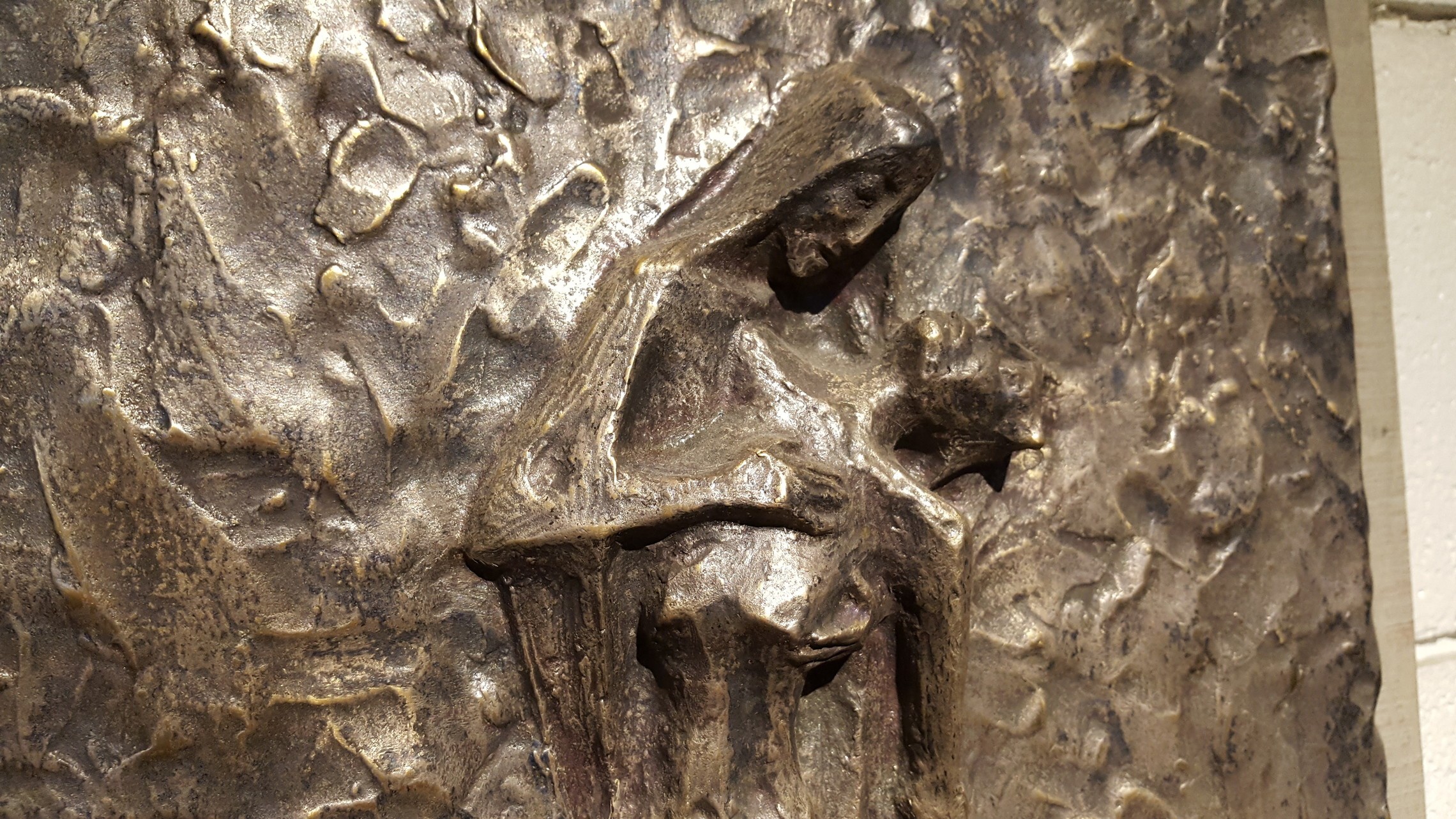 The copper figures were mounted on rough-sawn wood by Barbara and, years later, text was added beneath them. The content of the text was borrowed from Henri Nouwen’s “Stations of the Cross.” Dale Oftedal, a local artist, calligraphed the manuscript beneath each station on parchment.